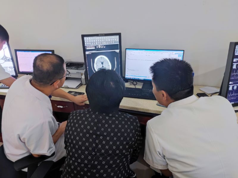 會(huì)前,在CT/MRI室領(lǐng)導(dǎo)的陪同下,西安交大二附院張秋娟教授參觀了我院院史館,了解我院建設(shè)發(fā)展的風(fēng)雨歷程及光榮歷史;隨后,邀請(qǐng)張秋娟教授來到醫(yī)生診斷室,現(xiàn)場(chǎng)會(huì)診近期遇到的中樞神經(jīng)系統(tǒng)疑難病例,并為我們答疑解惑,詳細(xì)講述病例分析思路及鑒別要點(diǎn)。