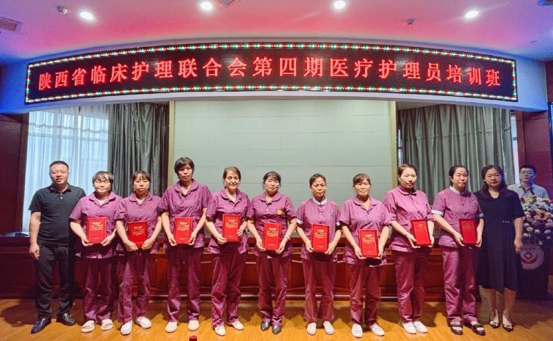 培訓結束后,延安大學咸陽醫院院長助理兼護理部主任楊敏、陜西金萌泰健康科技有限公司總經理吳勝潤共同為護理員代表頒發結業證書。