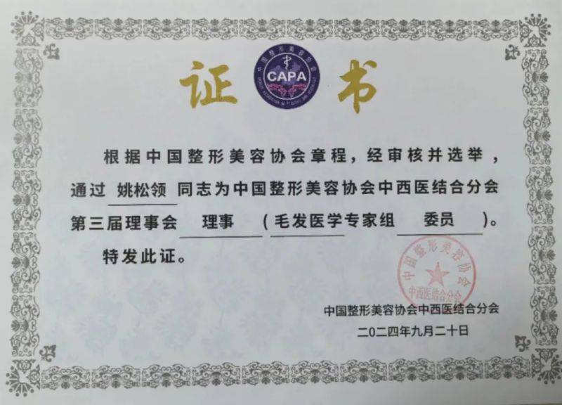 在本次大會上,我院皮膚科主任陳小艷教授被聘為中國整形美容協會中西醫結合分會第三屆理事會理事(毛發醫學專家組副主任委員),并受邀進行學術報告;皮膚科姚松領醫生被聘為中國整形美容協會中西醫結合分會第三屆理事會理事(毛發醫學專家組委員)。