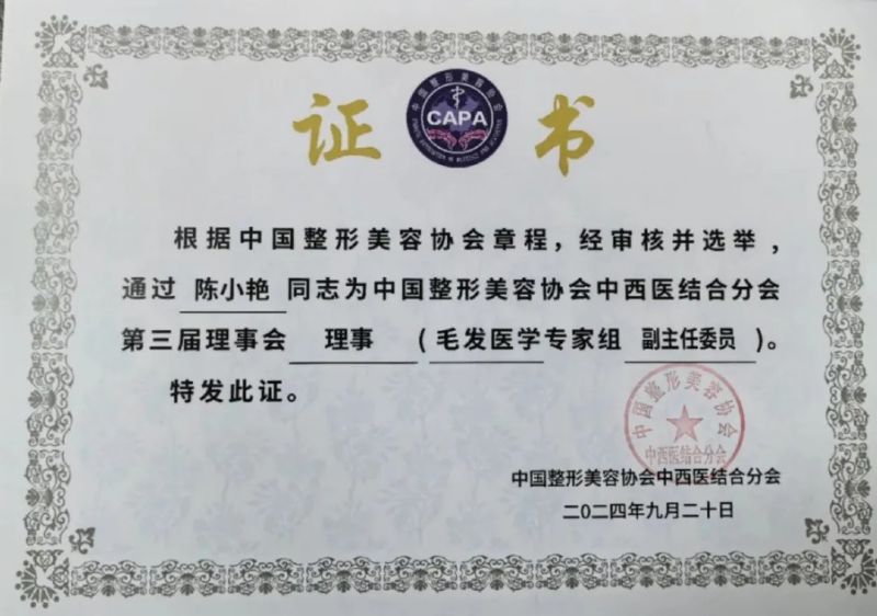 我院皮膚科主任陳小艷教授當選為中國整形美容協會中西醫結合分會第三屆理事會理事(毛發醫學專家組副主任委員)