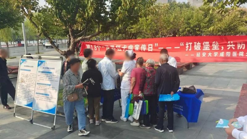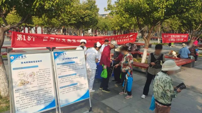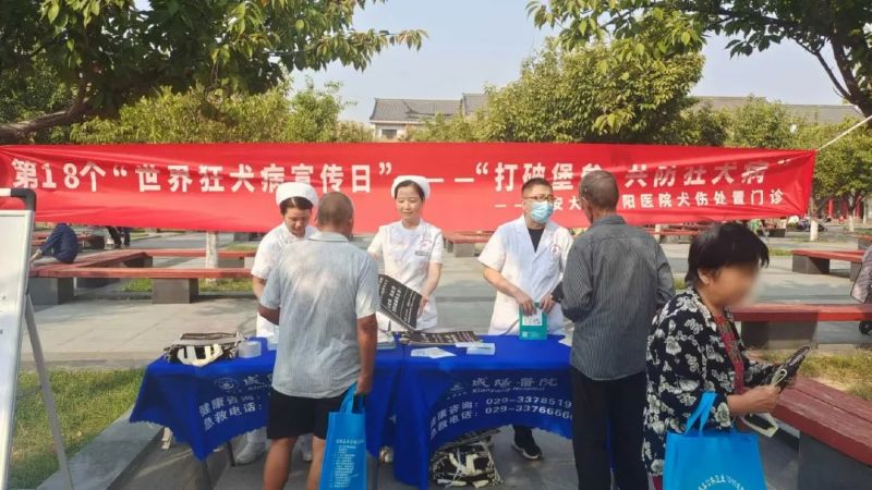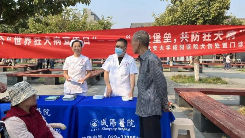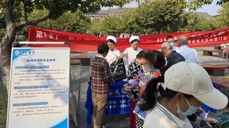 活動現場形式多樣,內容豐富,懸掛醒目主題橫幅,設立宣傳咨詢臺,精心布置了圖文并茂的知識海報,吸引了一波又一波市民駐足觀看與咨詢。延安大學咸陽醫院犬傷規范化處置門診醫護人員充分發揮專業優勢,通過現場互動方式講解展示、分發宣傳折頁以及面對面咨詢方式,向過往群眾詳細介紹了狂犬病的傳播途徑、危害及預防措施,特別強調了傷口處置和疫苗接種等暴露后規范處置的重要性。