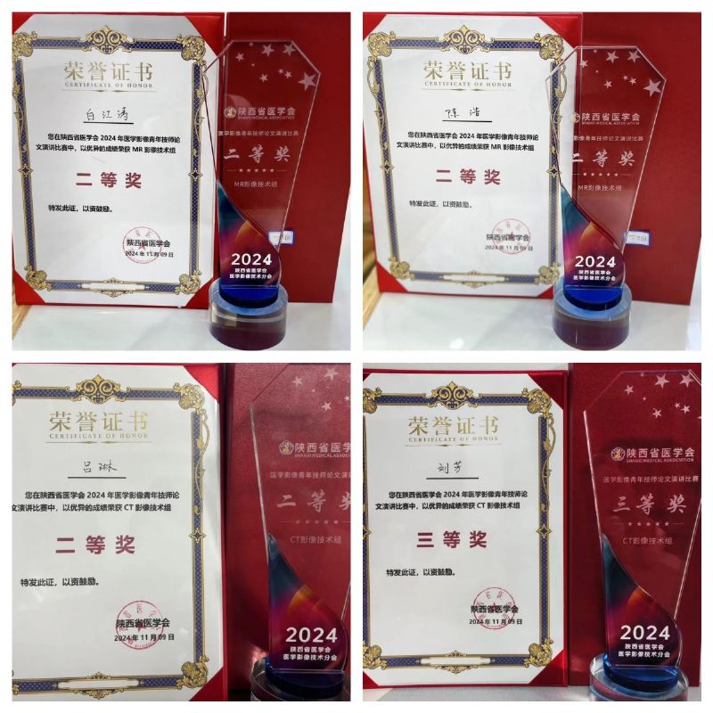 在青年技師演講大賽環節,我院青年技師代表隊憑借扎實的專業知識、清晰的演講邏輯和出色的現場表現,從眾多參賽者中脫穎而出,最終四人載譽而歸。其中白江濤、陳浩榮獲MR影像技術組二等獎,呂琳榮獲CT影像技術組二等獎,劉芳榮獲CT影像技術組三等獎。此次學術盛會,他們用專業的知識與扎實的基礎展現了我院醫學影像技術團隊的專業實力和青春風采,不僅為醫院及影像科贏得了榮譽,為我院在陜西影像技術界贏得了口碑,更為我省醫學影像技術的發展注入了新的活力。