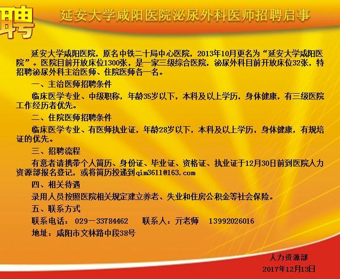 延安大學咸陽醫院泌尿外科醫師招聘啟事