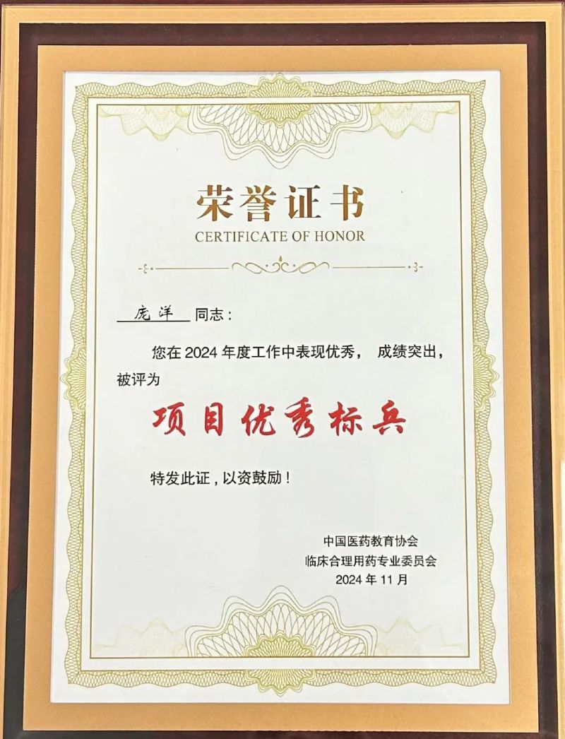 2024年11月23日,第九屆中國醫(yī)藥教育大會暨中國臨床合理用藥大會在天津隆重召開,我院藥學部被中國醫(yī)藥教育協(xié)會臨床合理用藥專委會授予“先進集體”,藥學部副主任龐洋代表醫(yī)院接受了表彰,其本人也被授予了“項目優(yōu)秀標兵”的榮譽稱號。