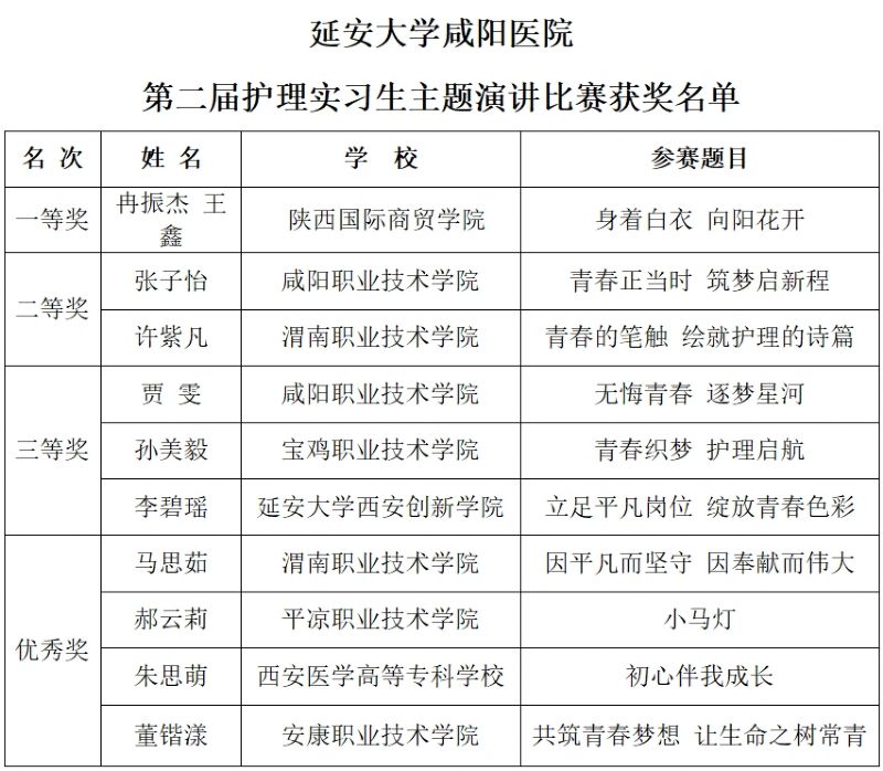 為弘揚南丁格爾精神,樹立實習生對護理職業生涯的憧憬和認知,理清成長脈絡,立足本職工作,同時為實習生提供展示自我的平臺和鍛煉成長的機會,在這初冬時節,我院護理教學管理委員會在腦血管病院第三學術廳成功舉辦以“青春、成長、筑夢、啟航 ”為主題的護理實習生演講比賽。科研教學管理中心副主任陳青、護理教學管理委員會主任委員黨文婷總護士長、全體教學管理委員會委員、教學組長以及全體實習生共200余人參加。本次活動由陜西國際商貿學院的王妞妞和安康職業技術學院的張家瑋同學主持,教學管理委員會部分委員及部分教學組長擔任評委。
