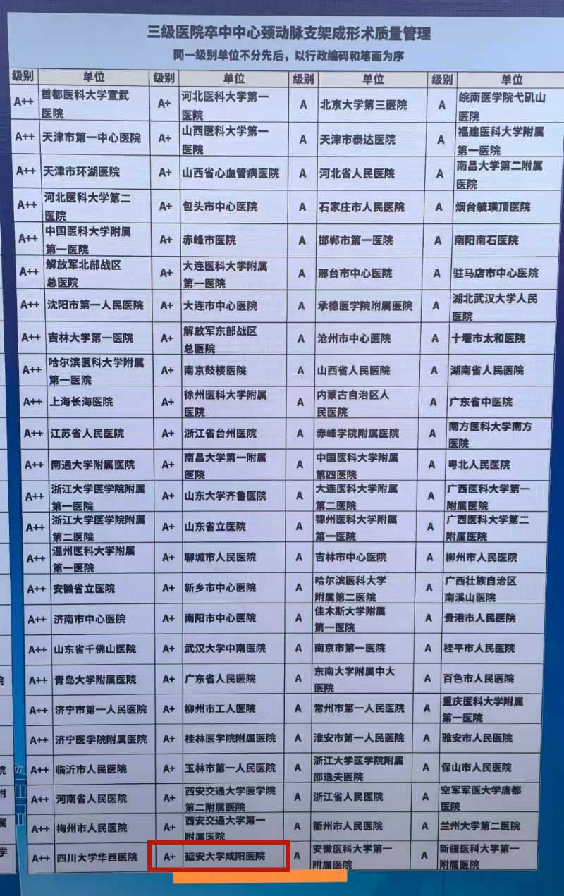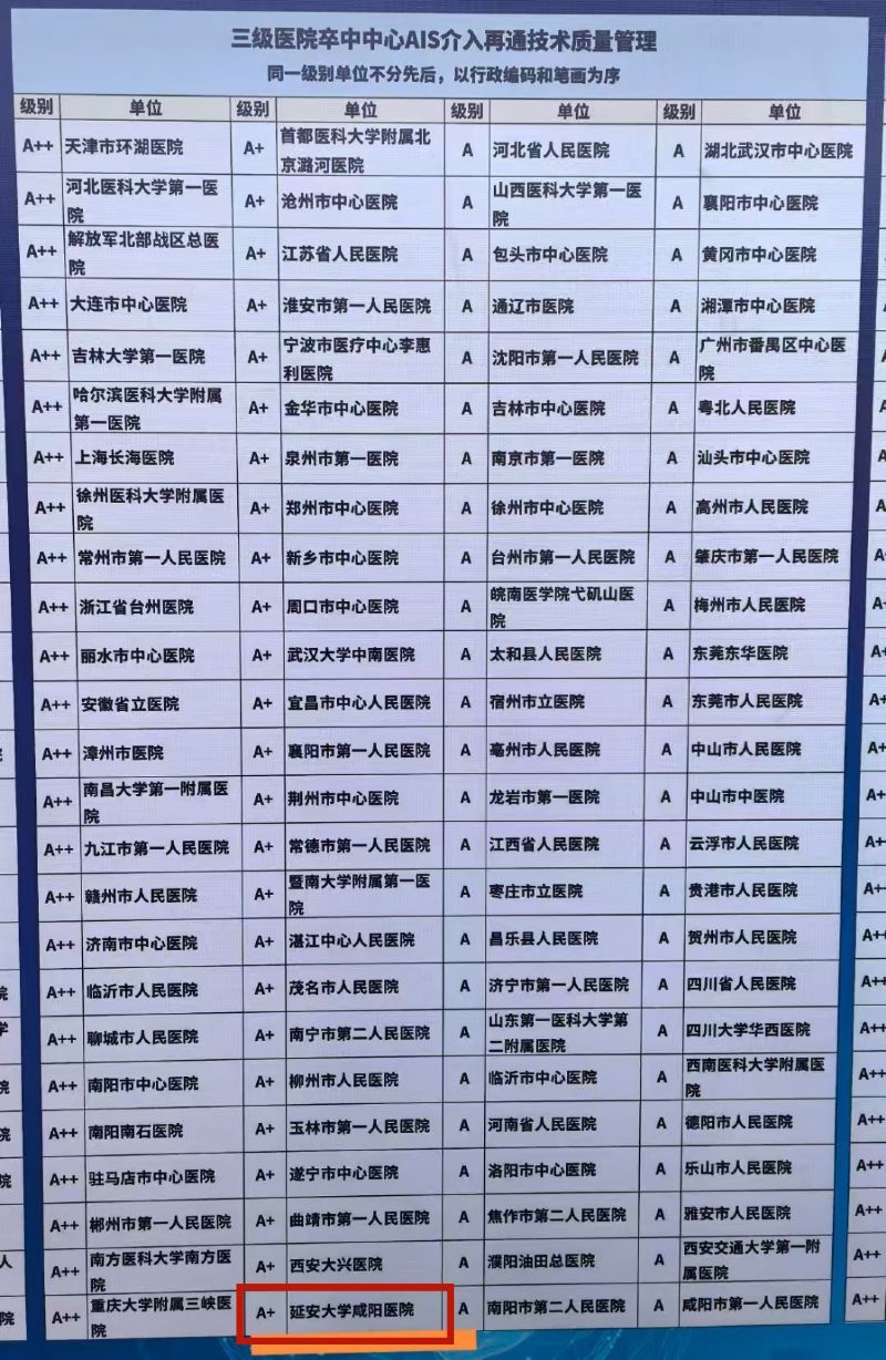 延安大學咸陽醫院卒中中心在中心建設綜合質量、靜脈溶栓、介入再通、頸動脈支架、共四項質量管理指標中全部獲得A+。展現出在卒中診療領域的強勁實力與專業高度。這一成績也標志著該中心在急性缺血性腦卒中靜脈溶栓、血管內治療、頸動脈支架等關鍵指標上達到了國內頂尖水平,為區域乃至全國的卒中患者帶來了更高質量的救治希望。