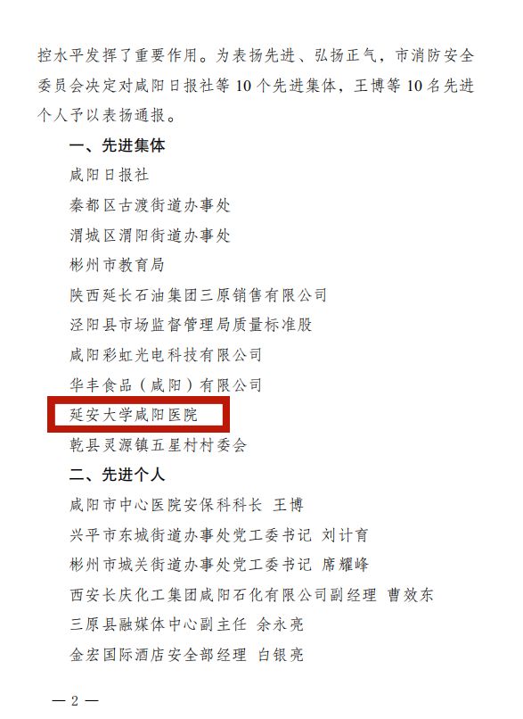 延安大學(xué)咸陽醫(yī)院在全市消防安全工作考核評(píng)比過程中脫穎而出,被咸陽市消防安全委員會(huì)授予“咸陽市119消防先進(jìn)集體”榮譽(yù)表彰。