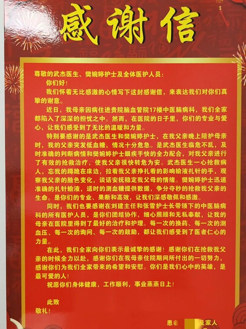 家屬們特別指出,患者的康復之路不僅得益于先進的醫療設備,更歸功于醫護人員的專業精神和周到服務。樊護士在照料患者時總是面帶微笑,用溫和的語言耐心解答他們的問題,給予了患者和家屬極大的心理支持。除了武杰醫生和樊婉婷護士,科室的其他醫護人員也在患者康復過程中展現了卓越的專業技能和優質的護理服務,為患者的恢復提供了無微不至的關懷。