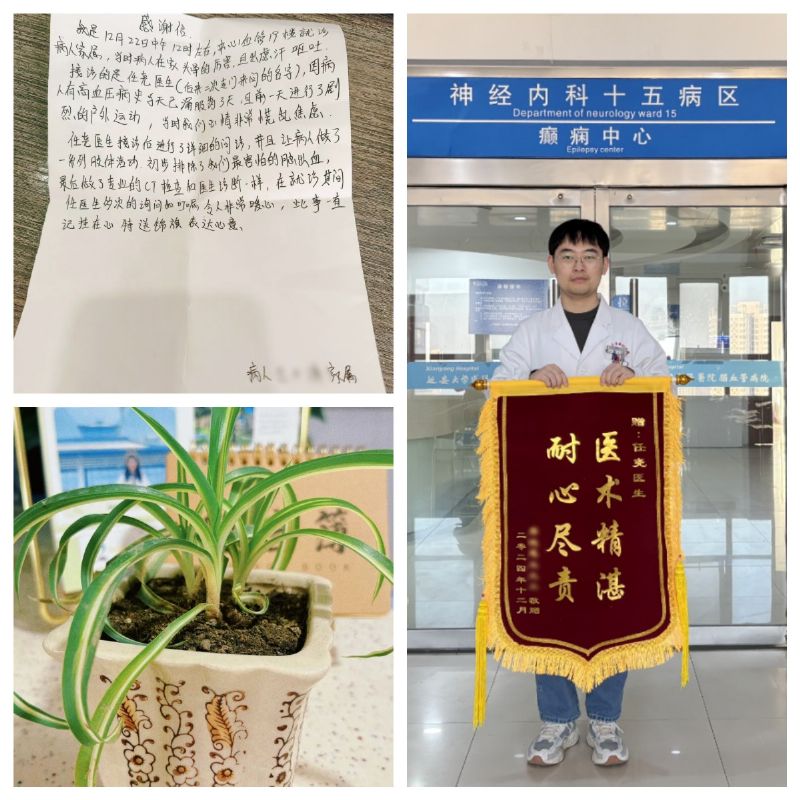 患者康復(fù)出院后,被任醫(yī)生的仁心仁術(shù)深深打動(dòng)。為了表達(dá)內(nèi)心的感激之情,12月31日早上特意送來一盆生機(jī)勃勃的綠植,寓意著生命的頑強(qiáng)與希望,也象征著任醫(yī)生給患者帶來的新生。同時(shí),患者還送上了一封飽含深情的感謝信和一面繡著“醫(yī)術(shù)精湛,耐心盡責(zé)”的錦旗。感謝信中的一字一句,都書寫著患者在患病期間的無助與恐懼,以及任醫(yī)生的出現(xiàn)給予他們的勇氣和力量。錦旗上的燙金大字,閃耀著患者對(duì)任醫(yī)生醫(yī)術(shù)和醫(yī)德的高度贊譽(yù),這不僅僅是一份榮譽(yù),更是一份責(zé)任與擔(dān)當(dāng)?shù)南笳鳌?