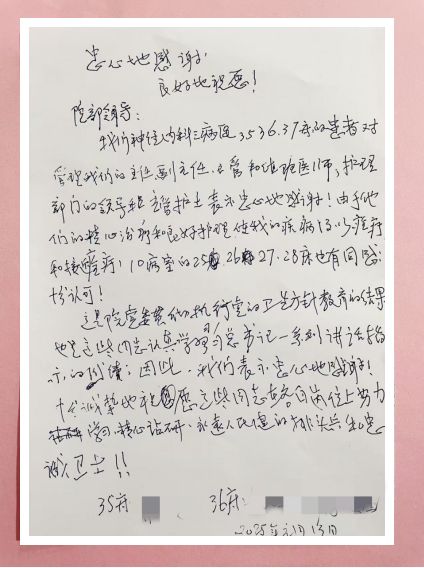 這封感謝信,如同一股暖流,溫暖了神經內科三病區,也激勵著每一位醫護人員繼續前行。醫患之間的信任與理解是治愈疾病不可或缺的力量。神經內科三病區病房的七名患者,用他們的感謝信,為我們描繪了一幅醫患和諧、共克時艱的美好畫面。科室主任表示:患者的認可與滿意,是我們工作的最大動力。我們將繼續秉“以患者為中心”的服務理念,不斷提升醫療技術水平和服務質量,為更多患者帶去健康與希望。