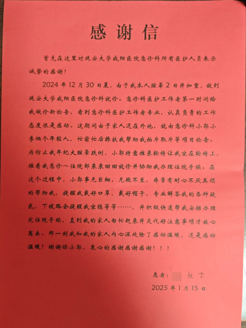 在兩人緊密配合下,患者快速完成各項檢查并辦理好住院手續(xù)。待家屬趕到時,又仔細(xì)告知患者病情及注意事項。患者在感謝信中飽含深情,對小郭和小李的善舉表達(dá)誠摯謝意。