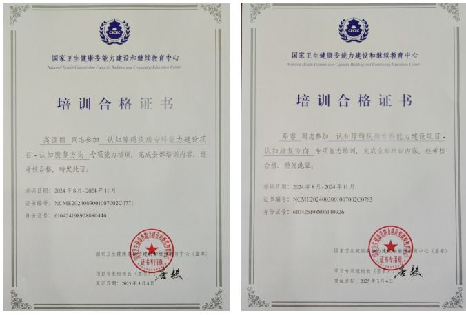 在認知障礙疾病診療領域不斷探索前行的征程中,我院又迎來一則振奮人心的喜訊!我院腦血管病院高強麗同志和鄧睿同志經過不懈努力,成功取得國家衛健委能力建設和繼續教育中心認知障礙疾病專科能力建設項目-認知康復方向專項能力培訓合格證書。這一成果的取得,不僅是兩位同志個人專業成長道路上的重要里程碑,更是我院在認知障礙疾病診療體系建設進程中的又一有力見證。