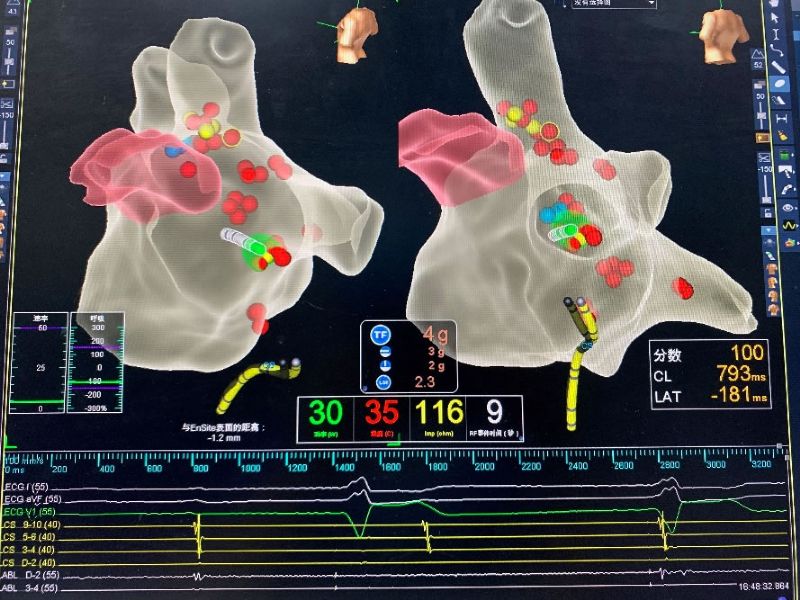 直立傾斜試驗(yàn)明確診斷為血管迷走性暈厥(心臟抑制型),動(dòng)態(tài)心電圖捕捉到長(zhǎng)達(dá)2.023秒的RR間期,結(jié)合一度及二度I型房室傳導(dǎo)阻滯等特征,專(zhuān)家團(tuán)隊(duì)判定患者存在顯著自主神經(jīng)功能紊亂。面對(duì)這一國(guó)際公認(rèn)的診療難題,由吳棟梁教授、劉雄濤教授領(lǐng)銜的專(zhuān)家組果斷決策,采用國(guó)際前沿的心臟神經(jīng)節(jié)射頻消融術(shù)進(jìn)行治療。