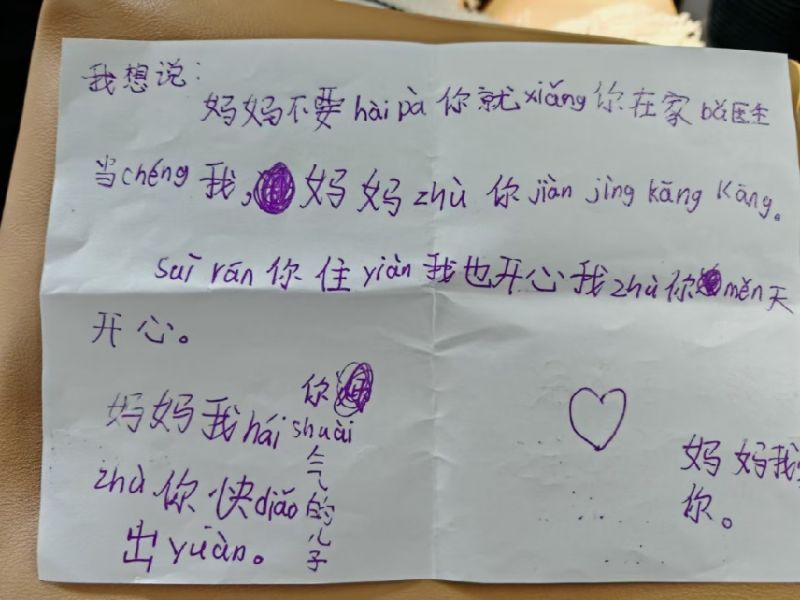 瑤瑤:“工作中我一直勤勤懇懇,認(rèn)真負(fù)責(zé),對(duì)待每位患者都熱情周到服務(wù),用真誠與熱情溫暖著每一位患者的心。面對(duì)行動(dòng)不便的患者,會(huì)主動(dòng)上前攙扶,遇到情緒焦慮的患者,會(huì)停下手中的工作,用專業(yè)知識(shí)和溫暖話語安撫化解患者的不安。經(jīng)常受到領(lǐng)導(dǎo)與家屬的好評(píng)。生活中由于工作原因沒有太多時(shí)間陪我兒子,但是我會(huì)讓兒子感到不管我在哪里都很愛他,我會(huì)經(jīng)常對(duì)他說媽媽愛你,出門的時(shí)候會(huì)抱抱他,他現(xiàn)在已經(jīng)7歲了,我還是會(huì)這樣做。小的時(shí)候只要有時(shí)間我都會(huì)給他講繪本故事,每次不管多累都會(huì)陪他干他想干的事,下夜班回家他都不會(huì)打擾我,真的是個(gè)很暖、很省心的孩子。還有就是家里人的支持,一個(gè)有愛的家庭氛圍也是很重要的。這次生病后讓我收獲家人滿滿的愛。”這時(shí)她拿出手機(jī)讓我看孩子給她寫的信,讀著讀著瑤瑤突然趴到我的肩膀失聲痛哭起來。
