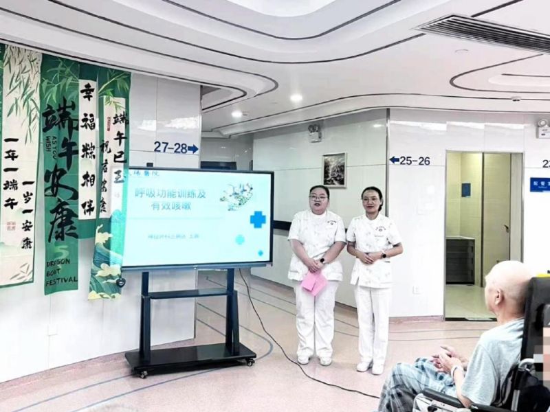 (一)科普講堂王護(hù)士為大家講解康復(fù)小知識(shí)。患者及家屬都學(xué)習(xí)到了呼吸訓(xùn)練(腹式呼吸、縮唇呼吸)及有效咳嗽的方法。