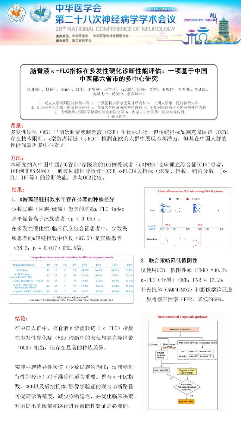 本次壁報交流涵蓋神經病學各分支領域,內容豐富且兼具深度與創新性。其中,趙雄飛副院長、張國勛副主任團隊的研究聚焦于“腦脊液κ-FLC指標在多發性硬化診斷性能評估:一項基于中國中西部六省市的多中心研究”這一關鍵課題。團隊通過多中心協作的方式,納入中國中西部6省市7家醫院的161例受試者,通過回顧性分析評估CSFκ-FLC相關指標(濃度、指數、鞘內分數[κ-FLC IF]等)的診斷效能,并與OCB比較。