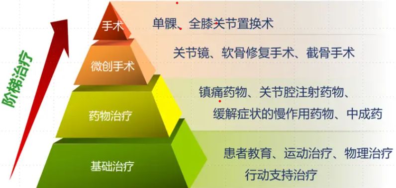 骨關節炎的治療并非只有吃藥和手術,而是遵循一個科學的“階梯治療” 原則。這個概念就像爬樓梯,從最簡單、最基礎的生活方式干預開始,如果效果不佳,再逐步升級到更復雜的治療方案。