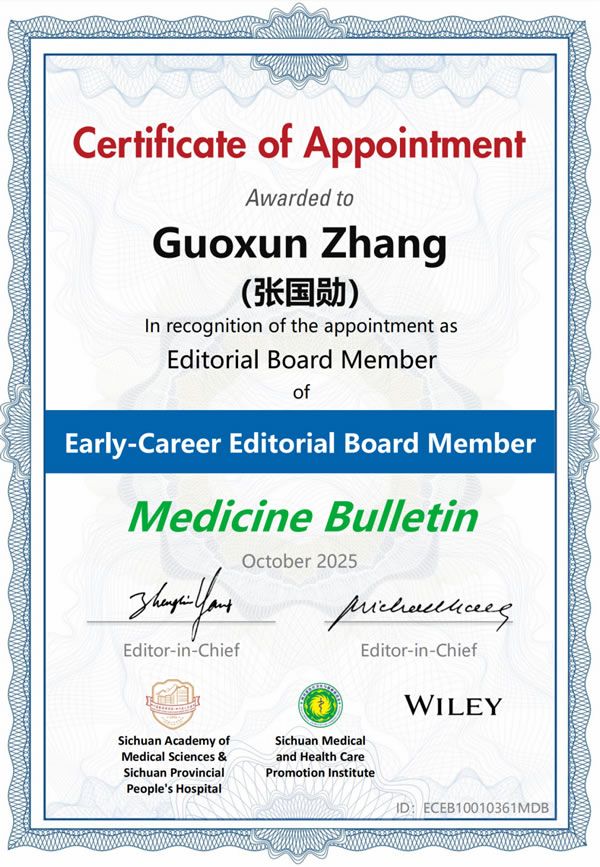 近日,延安大學咸陽醫院神經內科張國勛博士正式受邀擔任國際英文期刊《Medicine Bulletin》的青年編委。
