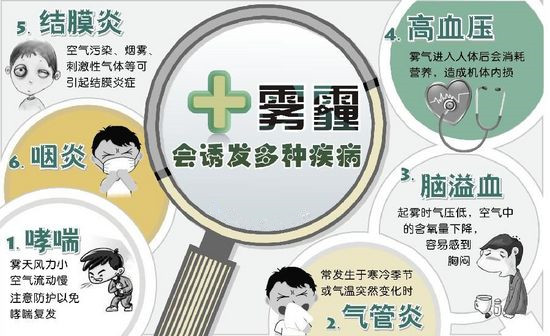 霧霾天氣時(shí)霧霾顆粒會刺激呼吸道,出現(xiàn)咳嗽、悶氣、呼吸不暢等,極易誘發(fā)包括支氣管哮喘、支氣管炎、過敏性鼻炎和變異性咳嗽等。有環(huán)保專家分析,灰霾很可能取代吸煙成為肺癌頭號致病“殺手”。