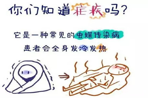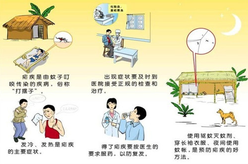 瘧疾,俗稱"打擺子"、"瘴氣"、"冷熱病",此病為夏秋之季最常見的危害人體健康的寄生蟲病。引起瘧疾的病原體是瘧原蟲,瘧原蟲是一種很小的寄生蟲,由蚊子傳播,當蚊子咬人吸血時,把瘧原蟲帶入人體血液,引起傳播流行。寄生于人體的有四種,即間日瘧原蟲、三日瘧原蟲、惡性瘧原蟲、卵形瘧原蟲。在我國,間日瘧原蟲較常見。