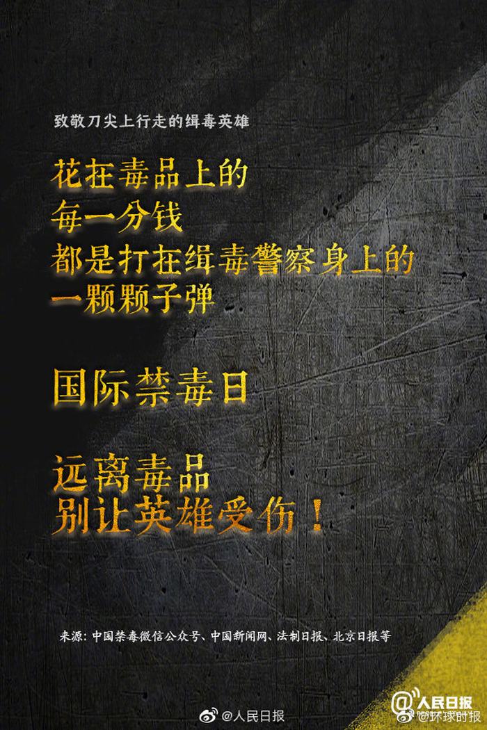 和平年代,禁毒被視為犧牲最大、最慘烈的戰(zhàn)爭。為了打贏這場戰(zhàn)爭,無數(shù)緝毒警察不僅時刻面臨犧牲家庭和身體健康的風(fēng)險,還可能奉獻(xiàn)自己的生命。請記住:花在毒品上的每一分錢,都是打在緝毒警察身上的一顆顆子彈。今天,國際禁毒日,遠(yuǎn)離毒品。