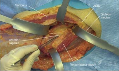 股外側皮神經:則走行于腹股溝韌帶的下方及縫匠肌和闊筋膜張肌的表面。由股動靜脈、股神經組成的神經血管束位于縫匠肌的內側,了解神經血管束的位置對于直接前側入路非常重要。