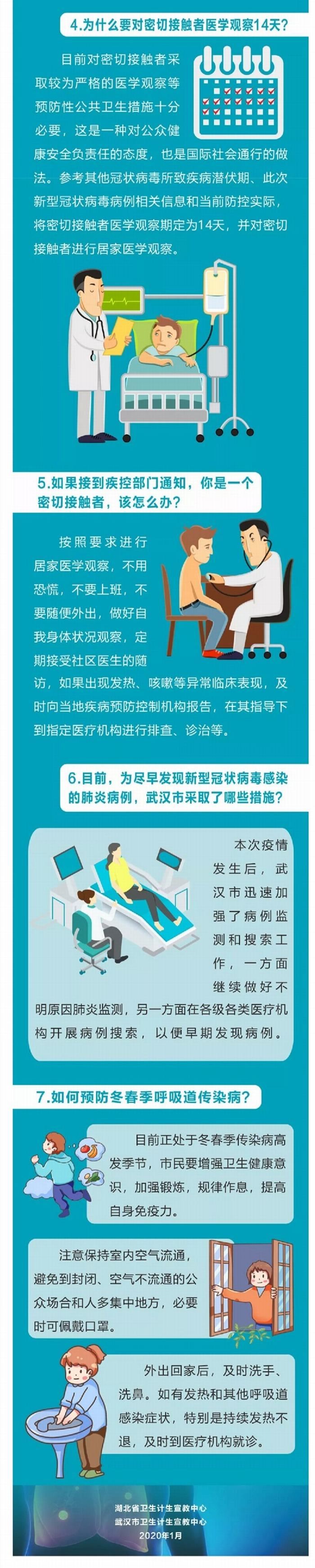 4、預防:傳染源和易感人群無法改變,只有從傳播途徑上想辦法。作為普通人,遠離傳染源是最好的預防。具體:1.遠離醫院(發病人群最集中的地方就是醫院了,尤其急診科、發熱門診、呼吸內科);2盡量遠離人多且密閉的環境如超市商場生鮮市場飯店等;3.盡量避免乘坐地鐵公交車等密閉人多的交通工具;4.保持基本的手衛生和呼吸道衛生,勤洗手,避免和有發熱咳嗽打噴嚏的人密切接觸,對于不可避免要出現在前述場景時,戴一次性外科口罩(至少兩層)或者N95口罩,一次性口罩最長4小時就需更換,或被水汽浸濕失去防護效果時也需要更換。5.出門注意防護,戴口罩。盡量手不要摸臉、不要揉眼睛、不要直接拿食物。回家時洗頭、洗澡、洗衣服,羽絨服之類不方便每天洗的,可以掛陽臺大風吹。開車的到家前,提前開全部車窗10分鐘大風吹。6.另,疫苗不要想了,新發現的病毒,從疫苗研發到量產要數年時間。
